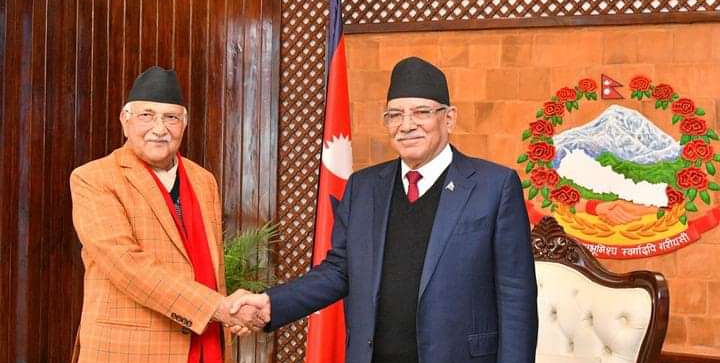 काठमाडौं : प्रधानमन्त्री पुष्पकमल दाहाल ‘प्रचण्ड’र एमाले अध्यक्ष केपी शर्मा ओलीबीच बालुवाटारमा भेटवार्ता भएको छ। सोमबार बिहान प्रधानमन्त्री प्रचण्डलाई भेट्न ओली प्रधानमन्त्री निवास बालुवाटारमा पुगेका हुन्।