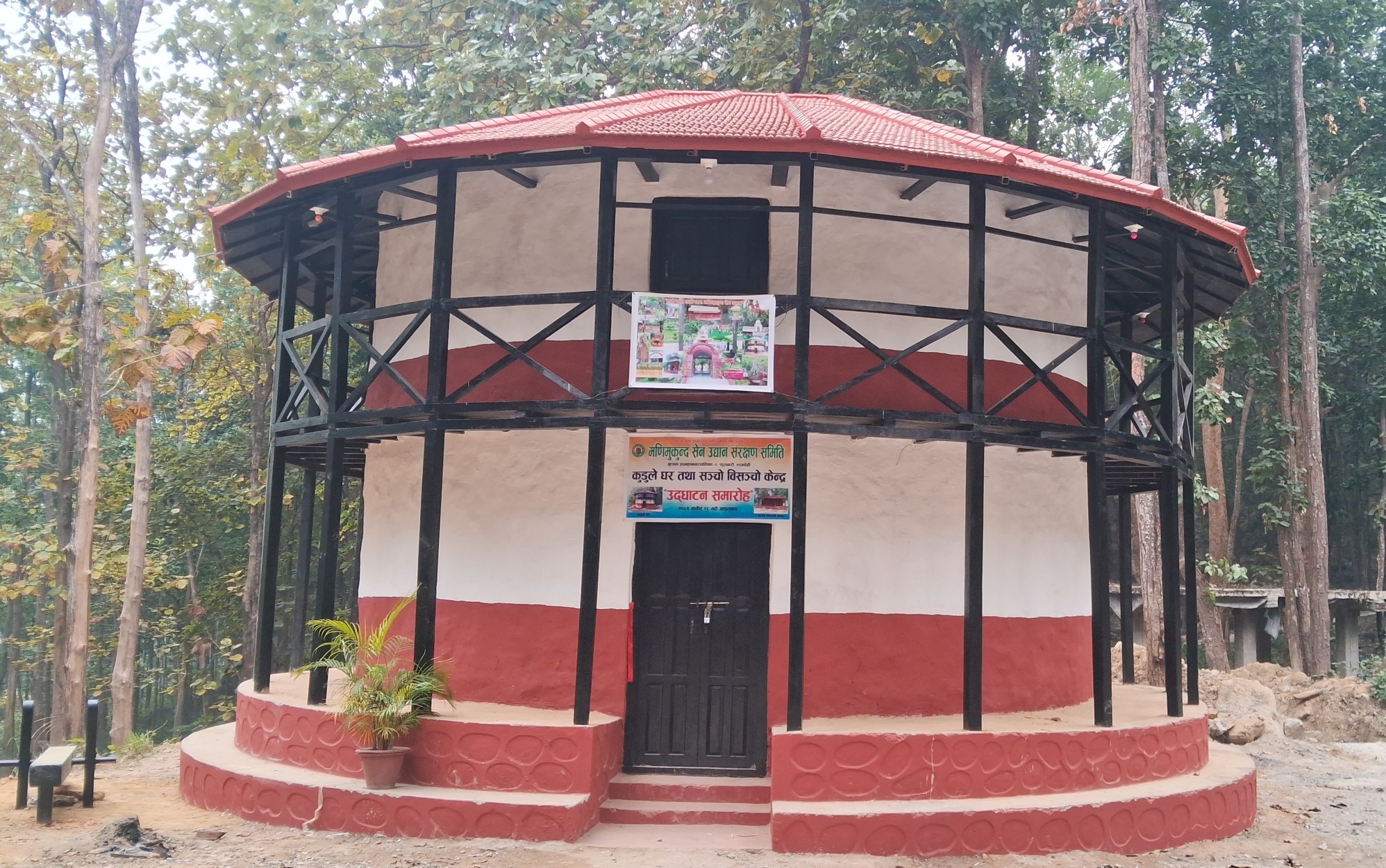 बाहिरबाट हेर्दा पनि चिटिक्क गोलाकार कुँडुले घर , घरको भित्रपट्टी पहाडी क्षेत्रमा प्रयोग गरिने परम्परागत सामग्रीहरु राखिएको छ ।